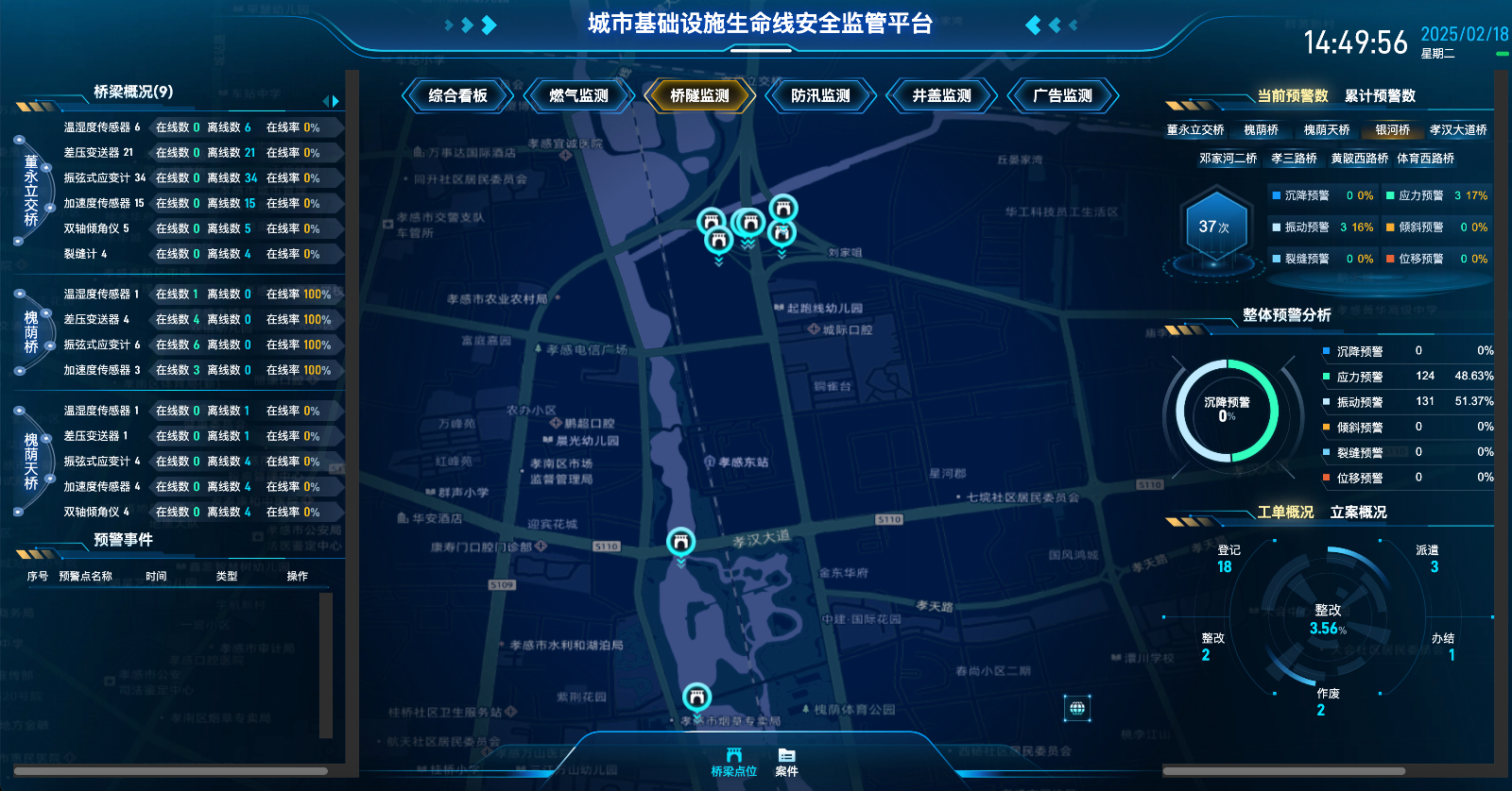 孝感市城市运行管理服务平台(以下简称“平台”)是响应住建部要求建设的标杆项目,旨在通过物联网、大数据、人工智能等技术,实现城市生命线基础设施的实时监测与风险预警,提升城市安全运行能力。平台于2024年4月试运行,同年7月通过预验收,其中桥梁安全监测系统作为核心模块,覆盖主城区14座桥梁,形成“监测—预警—处置—整改”闭环管理体系,显著提升桥梁安全监管效能。