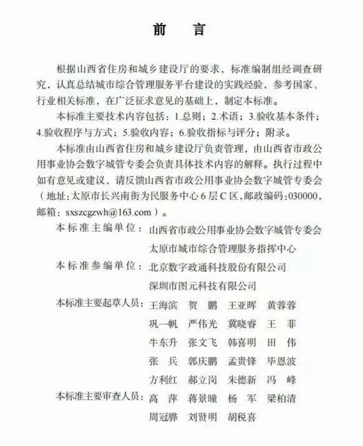 2020年3月24日,图元科技正式确认成为主要参编单位。历经一年多的潜心研究与讨论,2021年4月1日,山西省住房和城乡建设厅发布公告,批准《城市综合管理服务平台验收标准》为山西省工程建设地方标准(编号DBJ04/T418-2021),自2021年5月1日起实施。