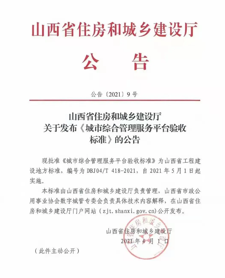 日前,山西省住房和城乡建设厅发布公告,批准《城市综合管理服务平台验收标准》(以下简称《验收标准》)为山西省工程建设地方标准(编号DBJ04/T418-2021),自2021年5月1日起实施。这是目前国内首部省级指导城市综合管理服务平台建设和验收的地方标准。