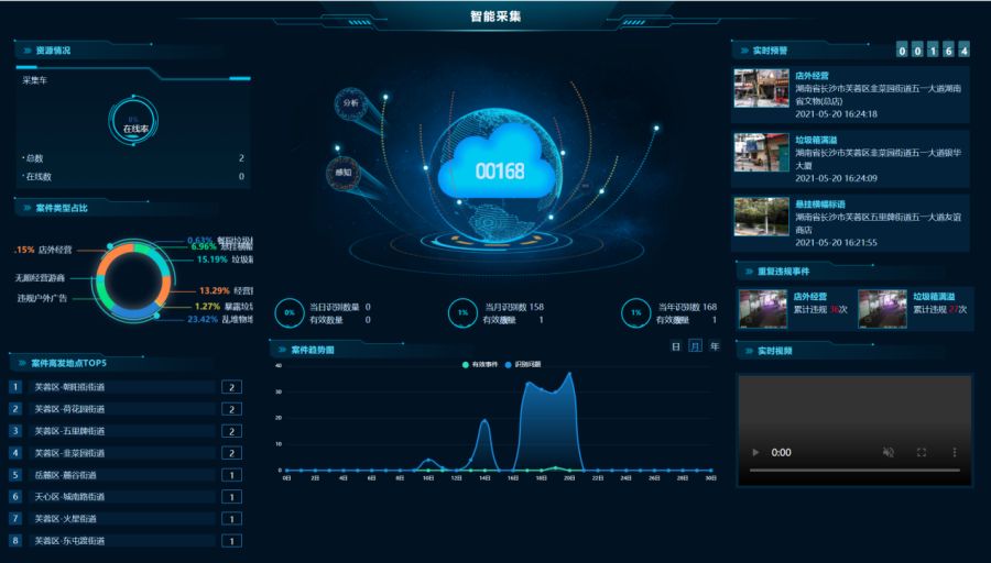 通过数据汇聚与云计算,可以宏观地展示城市全区域智能采集城管问题整体情况以及设施设备分析情况,同时展示事件识别整体情况、智能识别率、深度学习情况、设备在线情况、实时事件、事件高发时段、重复违规事件、案件高发地点、案件类型情况,实现与智慧城管业务优化整合、专业数据管理有效融通,数据资源全面开放共享,对城市管理事项进行实时感知、分析、决策,实现城市管理难点问题的源头分析。