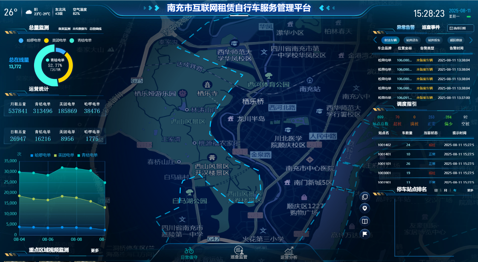 南充市互联网租赁自行车服务管理平台的核心在于构建了全市统一的数据中枢,破解了“家底不清”的监管盲区。