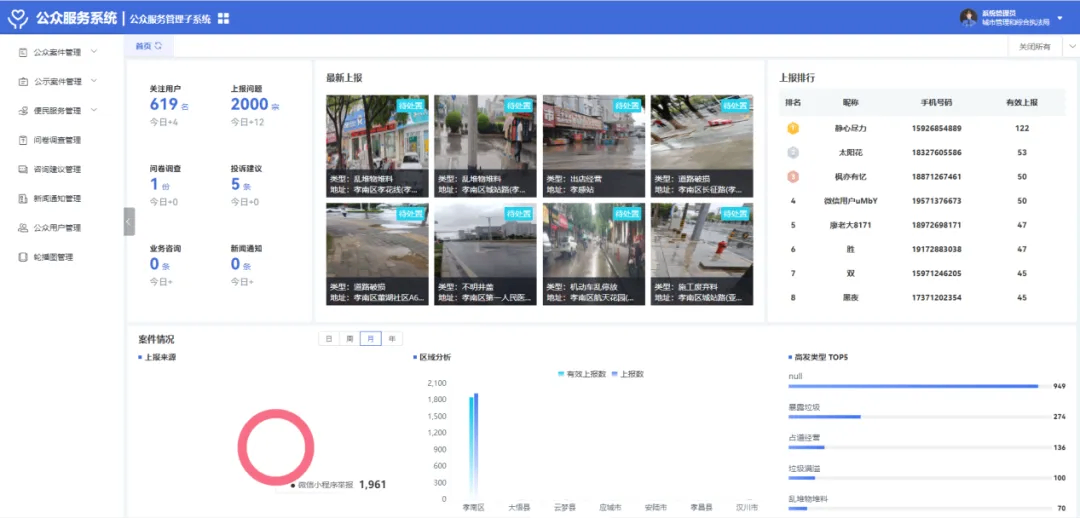 公众服务方面畅通市民群众举报问题,参与城市管理,基于孝感随手拍微信公众号升级改造,市民可以随时向平台反馈投诉、反应各类城市管理问题,并新建便民服务地图模块功能,可以通过便民服务地图查找公园、公厕和停车场等功能。